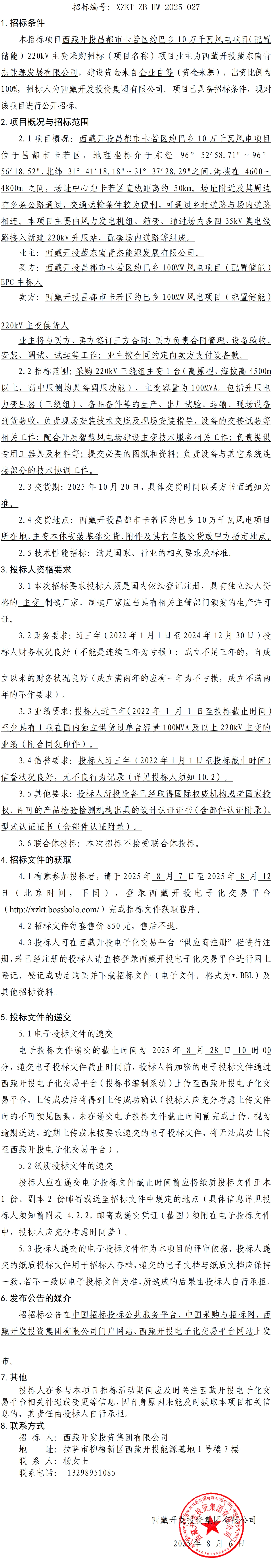 西藏開投昌都市卡若區(qū)約巴鄉(xiāng) 10 萬(wàn)千瓦風(fēng)電項(xiàng)目(配置儲(chǔ)能)220kV 主變采購(gòu)招標(biāo)公告